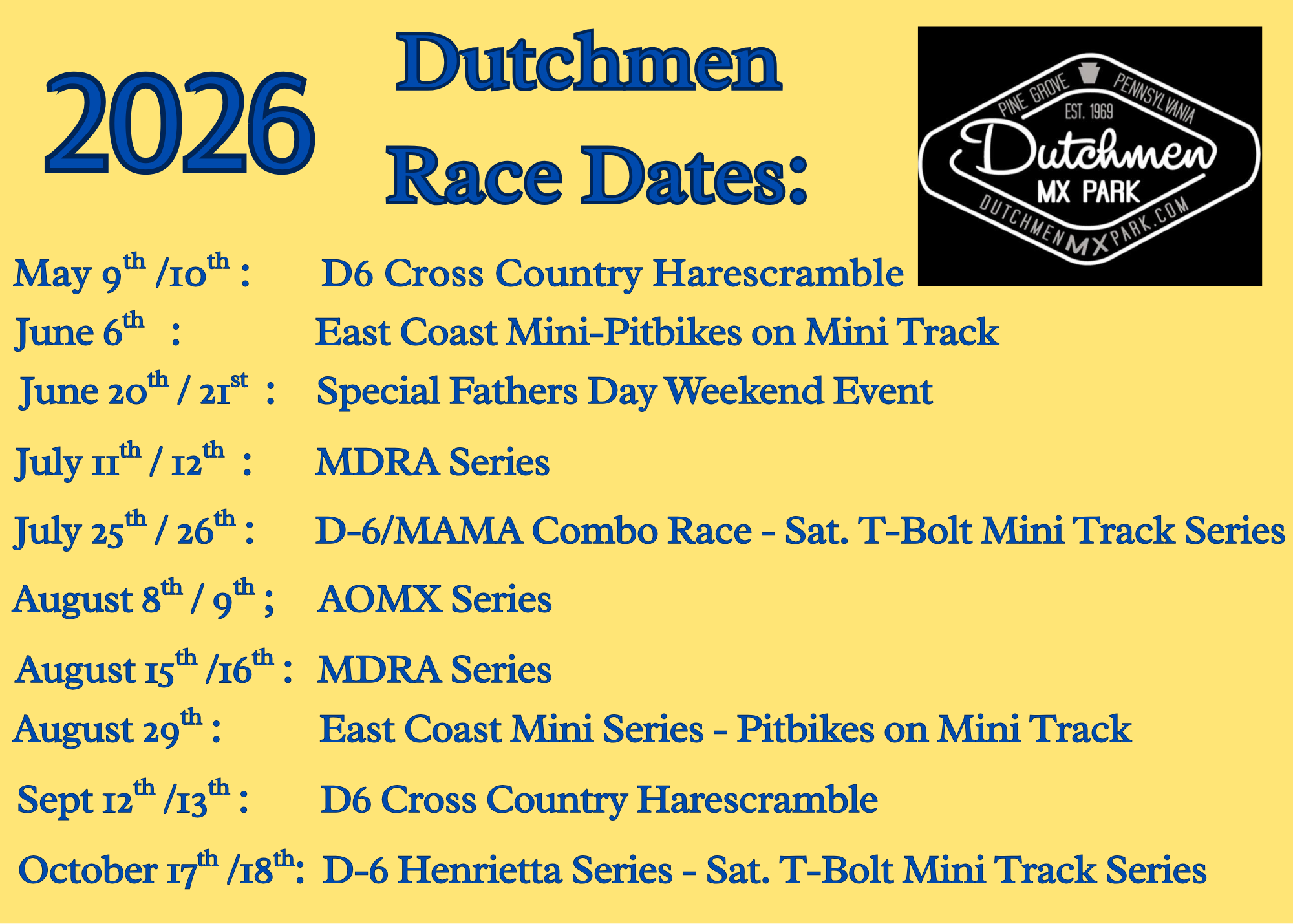 Dutchmen MX Park, formally known as the Flying Dutchmen, opened in 1969. It was operated by the Flying Dutchmen Motorcycle Club. It started out as a flat track and then transitioned into motocross. In 2006, it was taken over by the Papps, and it became Dutchmen MX Park. The Martins (that’s us!) took over in January, 2022 and have been working hard on the dirt and making updates to the facility! We currently hold open bike practice, MDRA, MAMA, D6 harescramble and D6 motocross events at our facility. You can click the events tab to check practice or race event dates. We hope to see you out here!